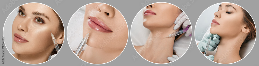 Beauty injections in cosmetology, collage. Beauty injections to female lips, neck, chin and around eyes area for beauty facial correction