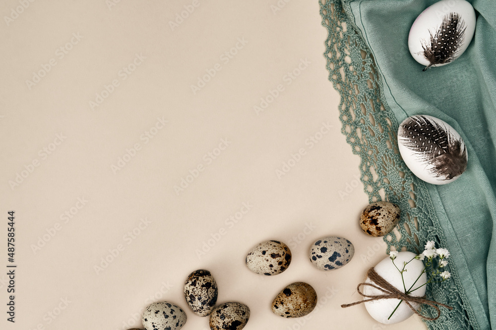 Directly above shot of easter eggs with natural feathers
