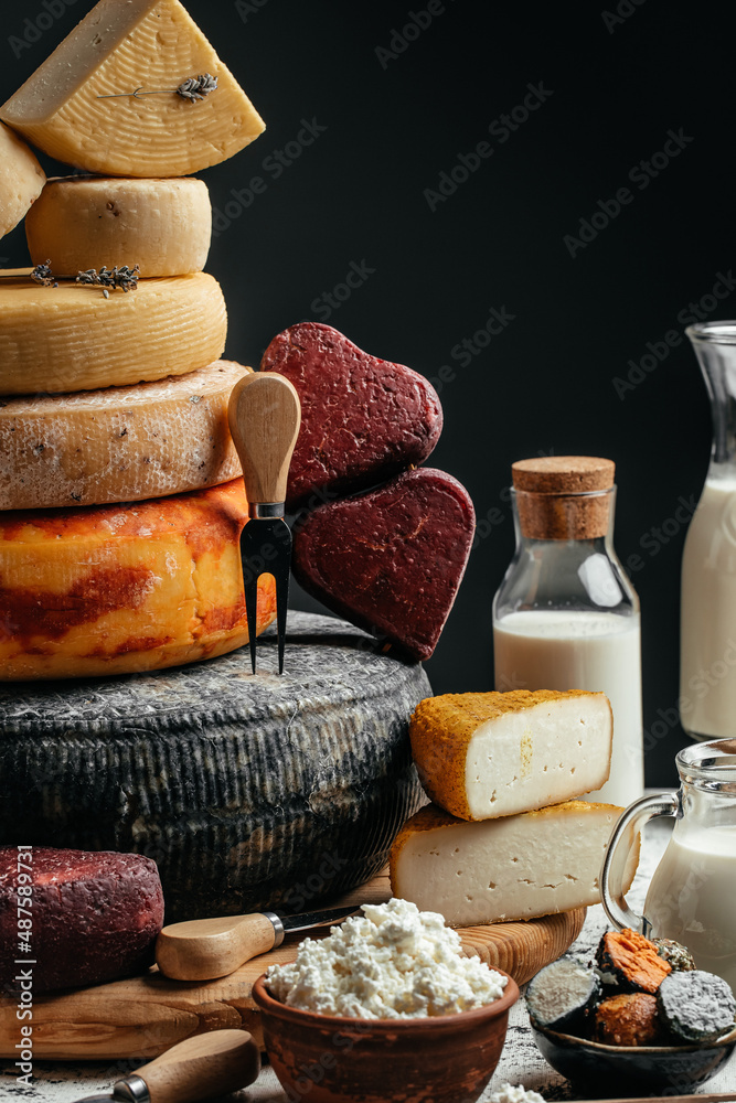 Various kind of cheese. head of handcrafted hard cheese on a dark background. banner, menu, recipe place for text,