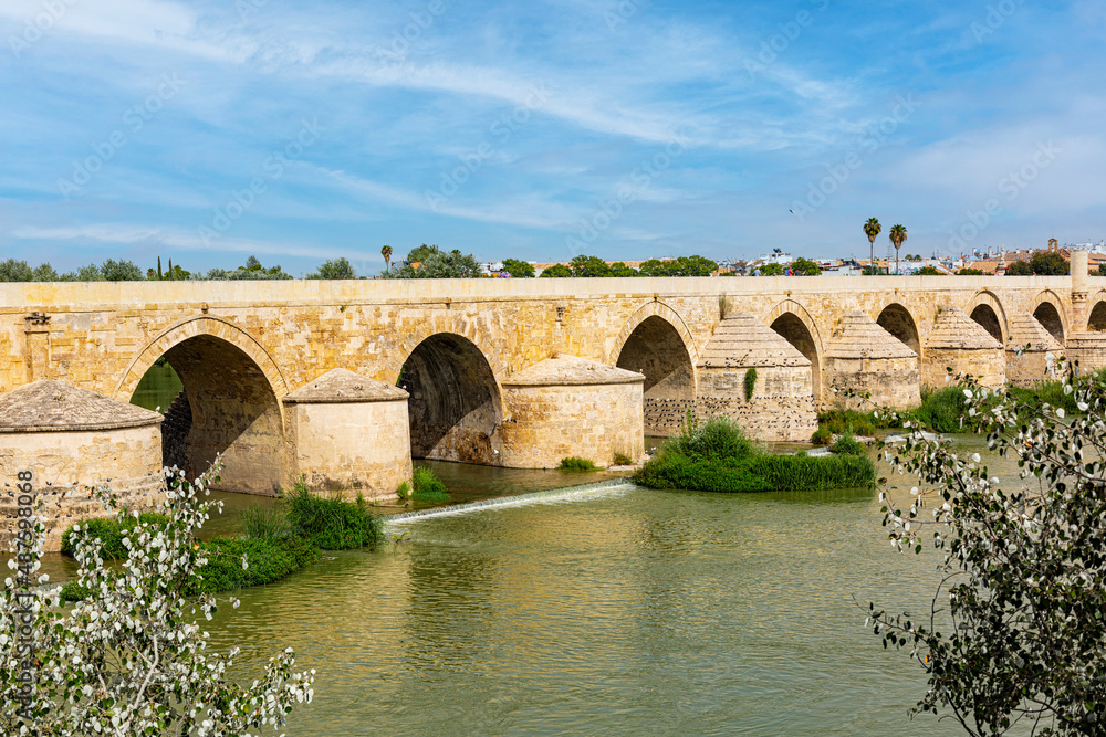 Cordoba, SPAIN - August 11, 2021:The Roman bridge of Córdoba, a stone bridge across the Guadalquivir river. Summer time.