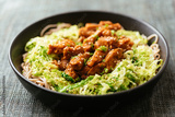 Spicy soy curls on shredded savoy cabbage, served with buckwheat noodles.