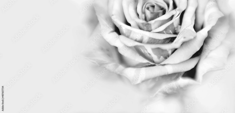 Soft focus blur black and white rose flower petal. Nature light delicate horizontal long background. Watercolor painting effect.