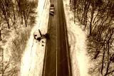 Truck accident, aerial view in winter, road icing in winter, drone view