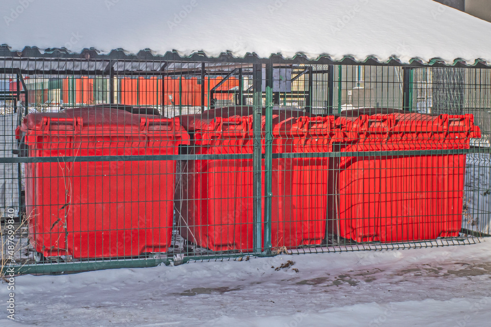 Closed area for garbage containers on a winter day