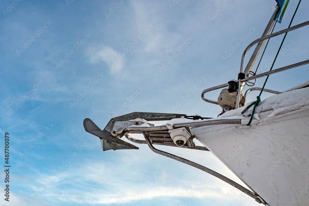 The bow of a pleasure yacht against the blue sky