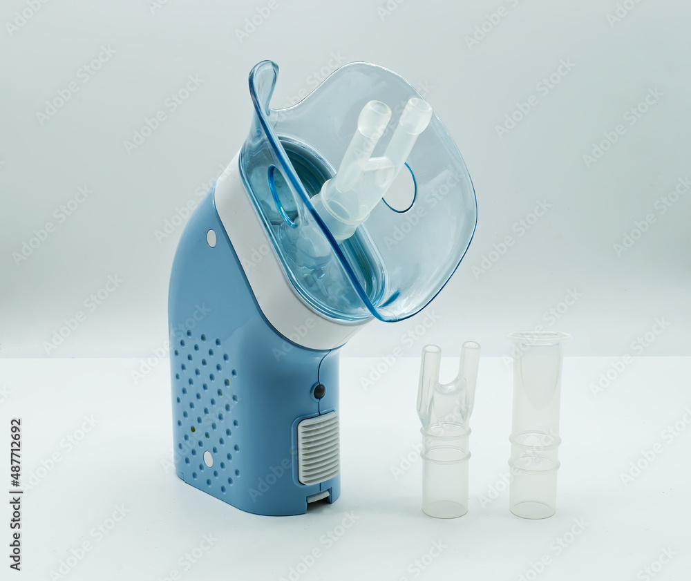 Portable compressor nebulizer on white table. Medical equipment for inhalation therapy, asthma, bronchitis.