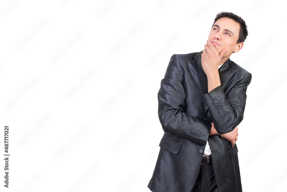 Dreamy man in elegant suit touching chin