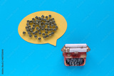 Yellow speech bubble and gold beads of alphabet with a miniature typewriter on a blue background.