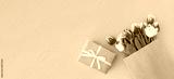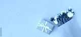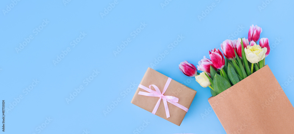 bouquet of colorful tulips in a paper bag with a gift box on a blue background