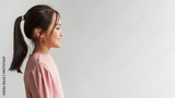 Cheerful Japanese Preteen Girl Posing Looking Aside, Gray Background