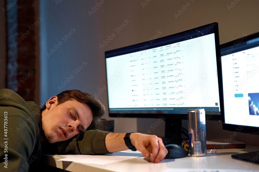 Cropped image of tired male trader sleep at desk