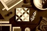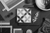 Flat lay of stylish architect moodboard composition with black, beige and grey samples of textile, paint, panels and tiles. Top view. Copy space. Template.