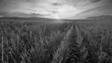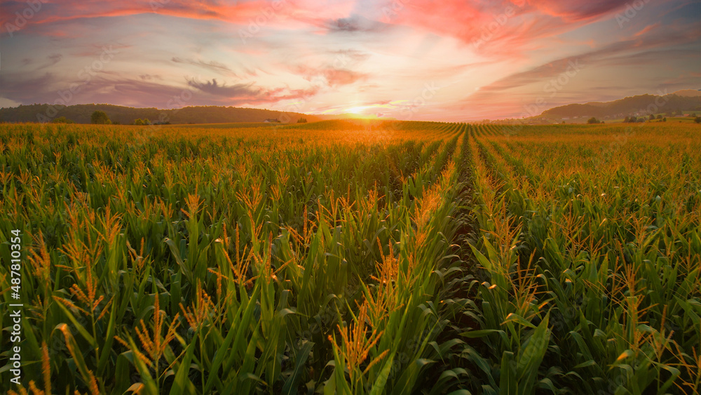 AERIAL: Flying over a vast field of corn on picturesque golden summer evening.