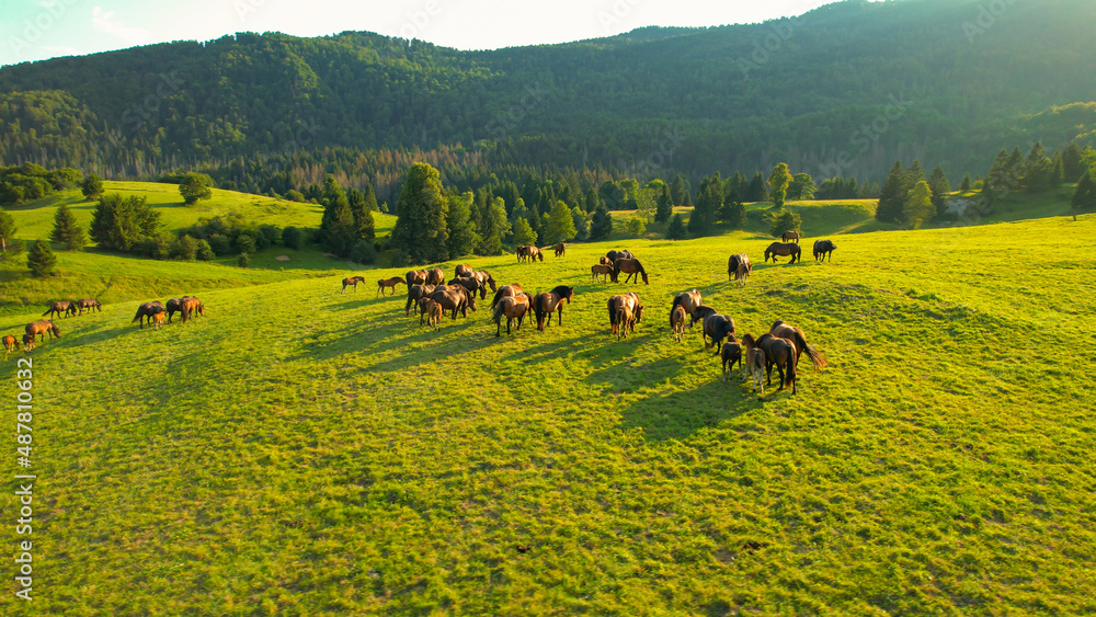 AERIAL: Idyllic shot of herd of horses scattered across golden-lit countryside.