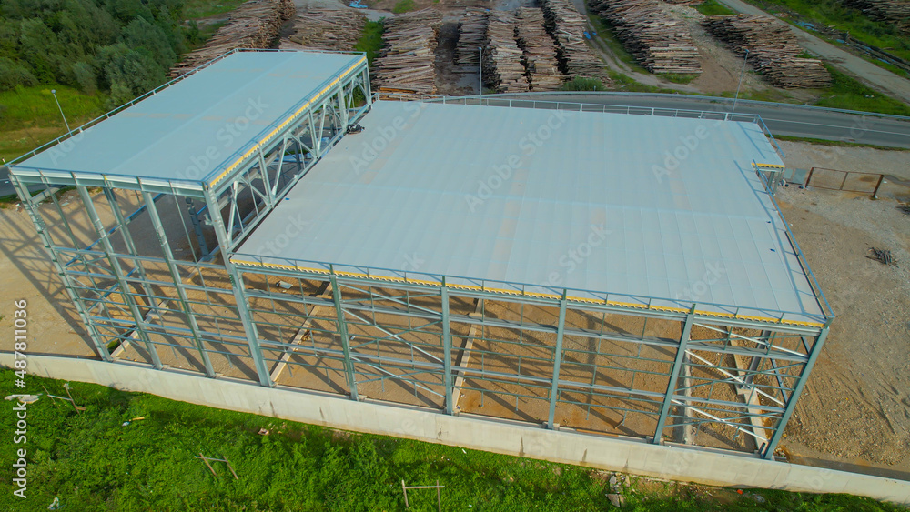 AERIAL: Drone view of steel frame of warehouse near lumber processing facility.