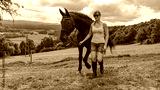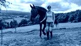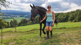 PORTRAIT: Happy female horseback rider leads her stallion from ranch enclosure.