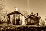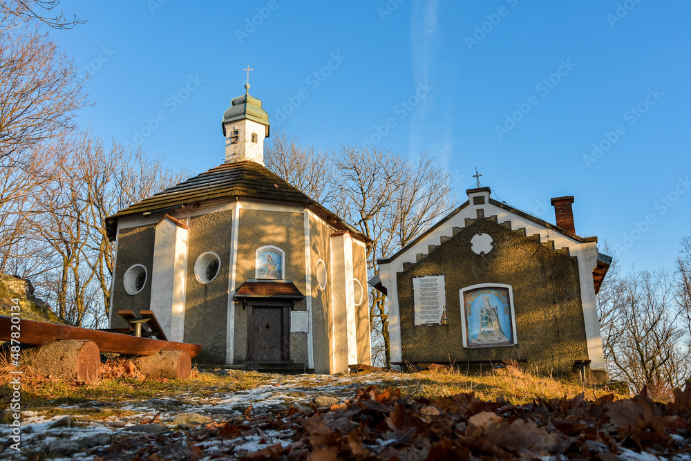 The mountain chapel of the Weeping Mother of God on the top of the mountain in the Bardzkie Mountains, view from the hiking trail at sunset.