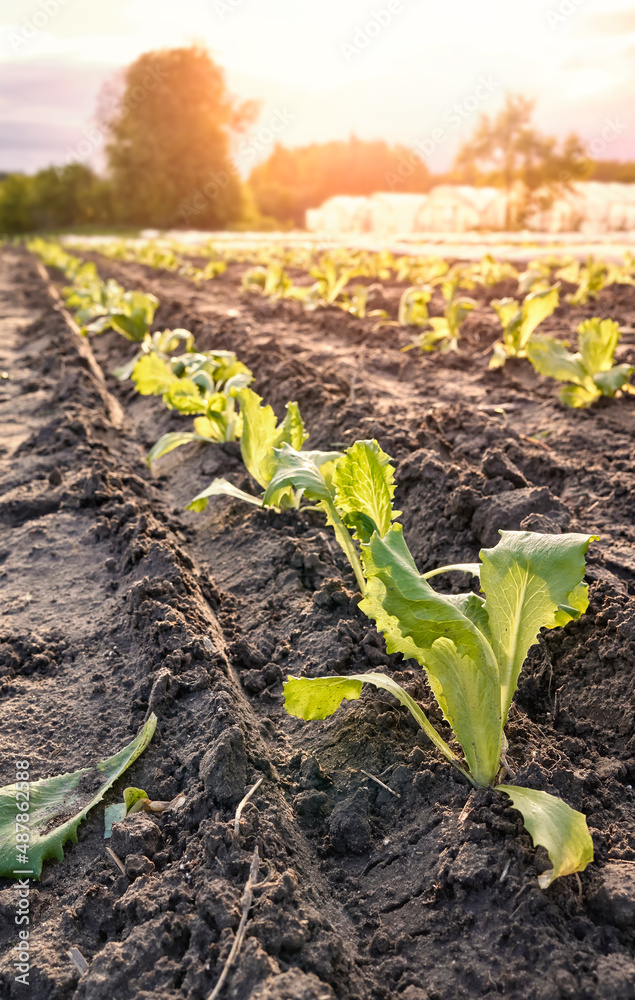 Organic seedlings planted in rows at sunset, selective focus on the foreground.
