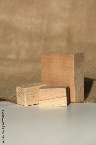 Wooden eco rustic platform podium on beige background. Minimal empty display product presentation scene.
