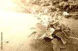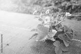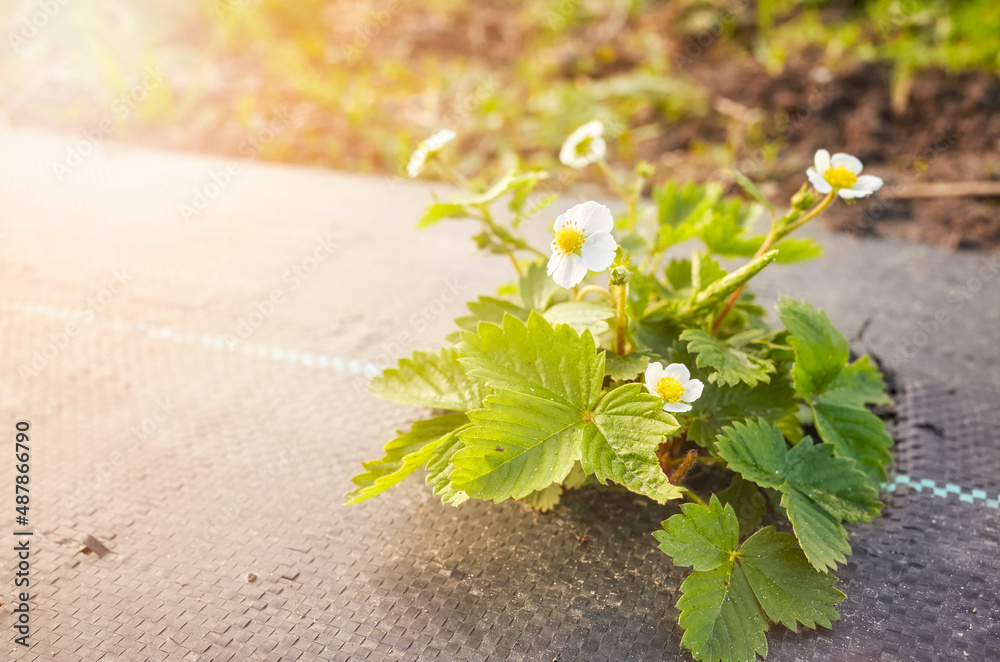 Wild strawberry in blossom on an organic farm field patch covered with agrotextile (fabric mulch mat) at sunset, selective focus.