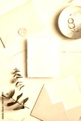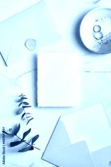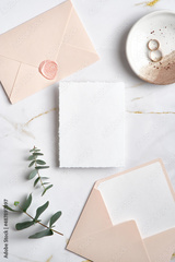 Wedding invitation mockup, pastel pink envelopes, golden rings, eucalyptus leaves on marble table. Elegant wedding stationery set. Flat lay, top view.