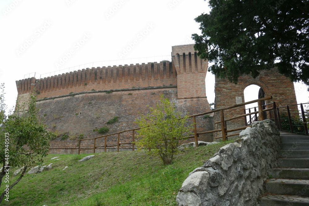 the fortress of Brisighella with mighty brick walls, two towers and the patrol walkway stands on a hill that dominates the village