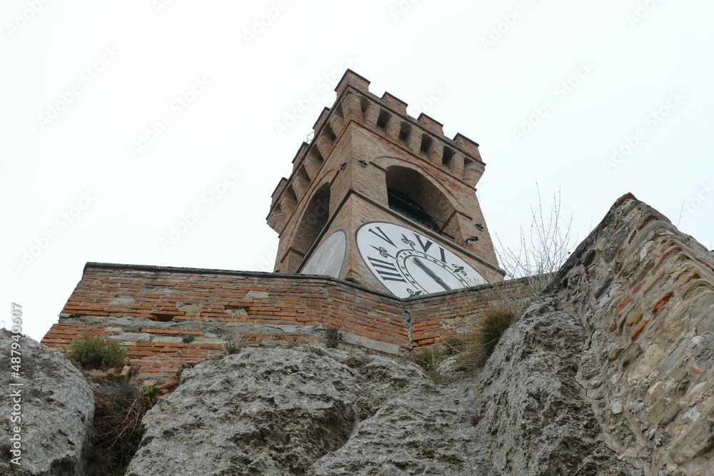 clock tower in Brisighella with mighty brick walls and the clock face at six hours on a hill that dominates the village