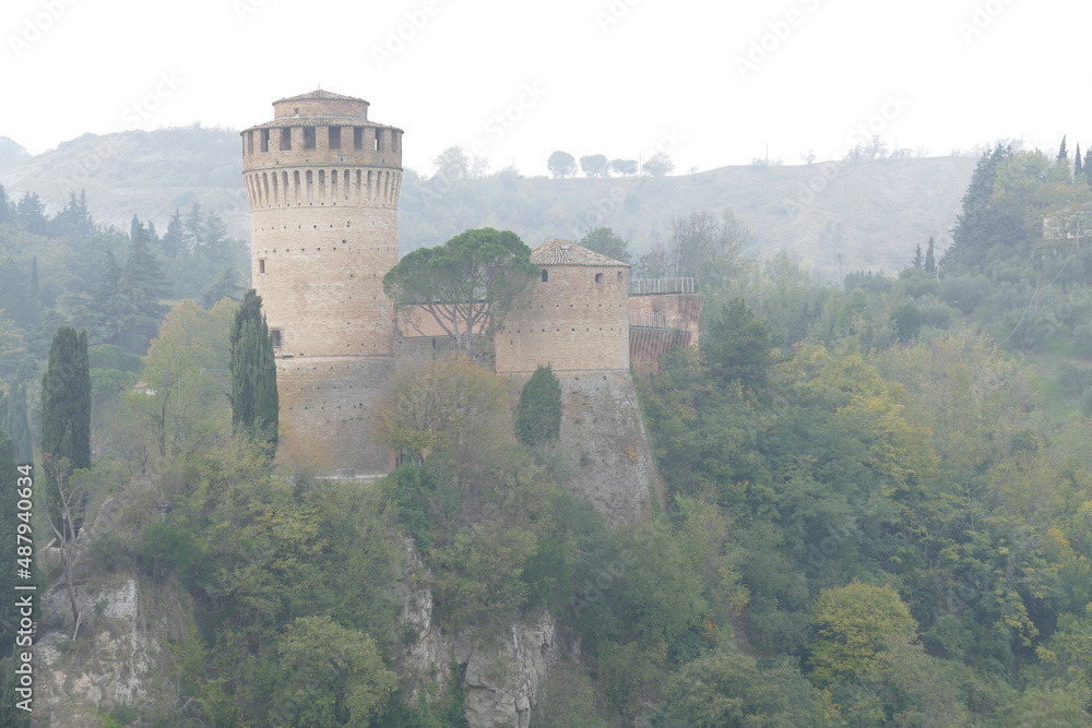 panorama of the fortress of Brisighella surrounded by the green countryside on a hill that dominates the village