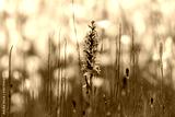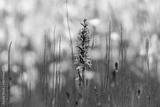 A flowering moorland spotted orchid in front of cottongrass
