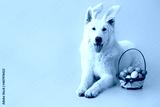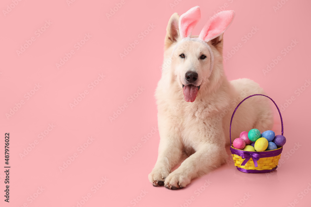 Funny white dog in bunny ears with Easter eggs and basket on pink background