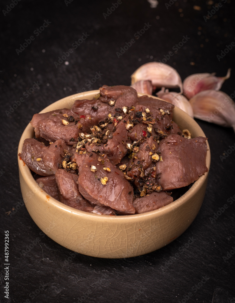 Raw game, beef meat in cubes, in a bowl, on a black background, blackboard, close up. Diced red meat with seasonings.