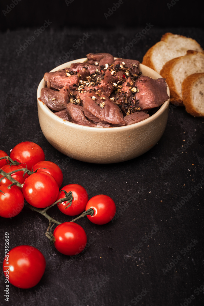 Diced raw game, beef meat in a bowl, on black background. Composition with red meat in cubes, cherry tomatoes and bread.