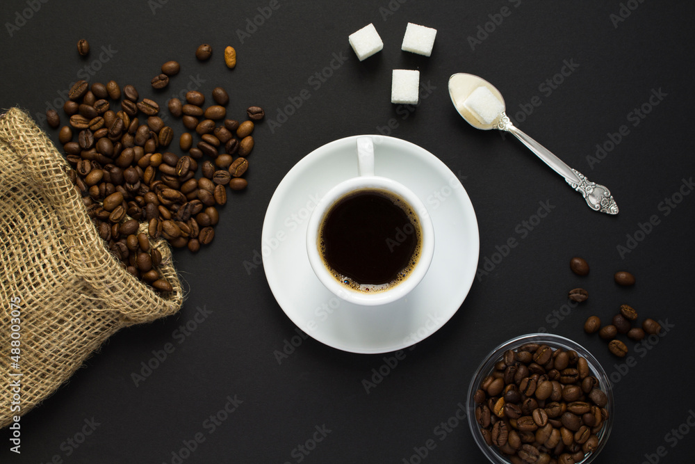Top view of black coffee in the white cup and coffee beans on the black background. Close-up.