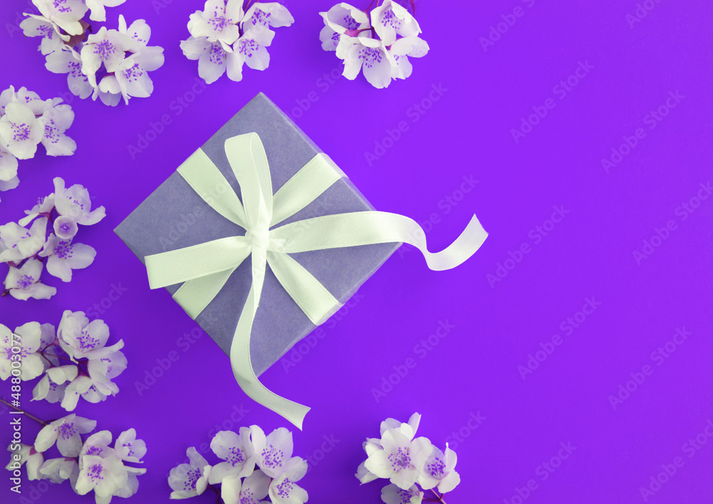 Gift box with tied white bow and jasmine flowers on purple background.Top view.Copy space.