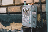 Electric box with garbage on it, installed on the building. Dirty. Cable. Safety. Wall. Power. Energy. House