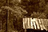 old roof of the house is made of boards. an old abandoned wooden house in the taiga. A hunting lodge in Siberia.