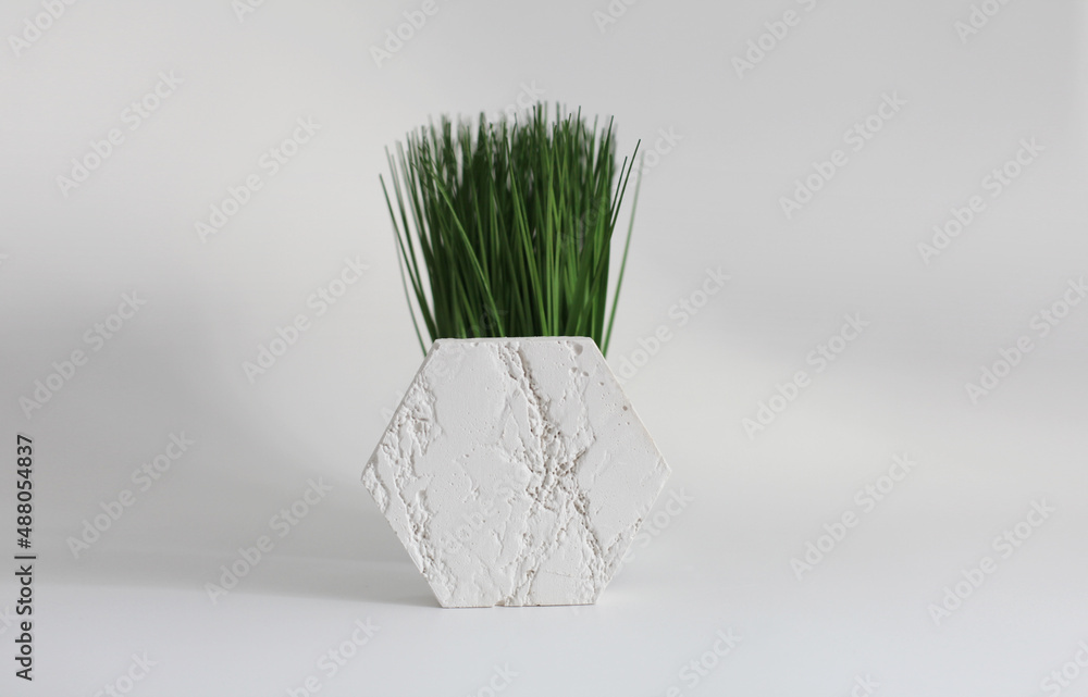 Empty texture stone platform podium and grass on white background. Minimal still life display product presentation scene.