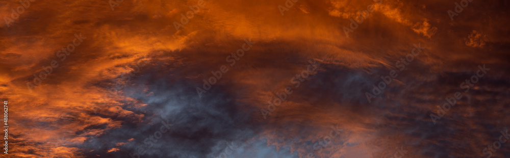 panorama sur les formes abstraites des nuages rouge et oranges pendant un coucher de soleil