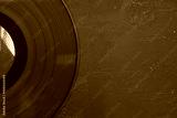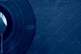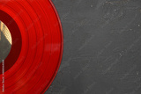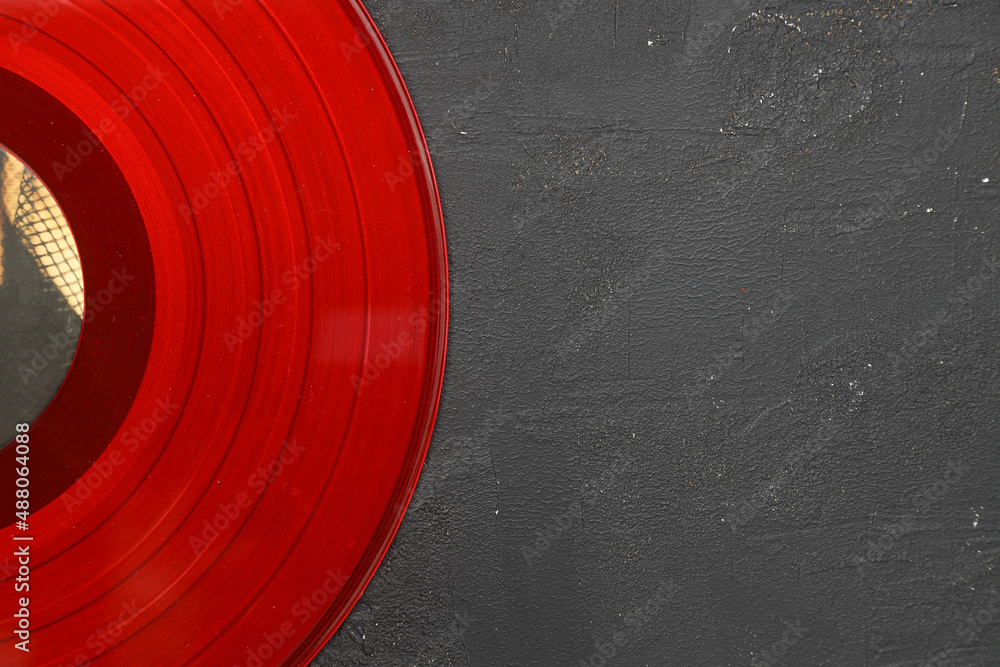 Red Vinyl record on a black stone background. Retro style. Top view.