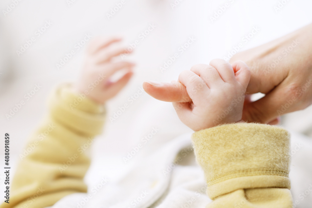 お母さんの指を握るアジア人の赤ちゃんの手元