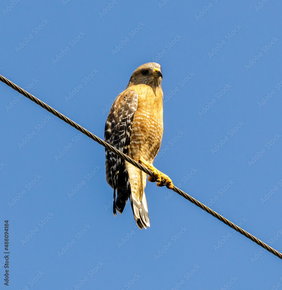 Red-shouldered Hawk perching on electric wire. Pearson-Arastradero Preserve, California, USA.