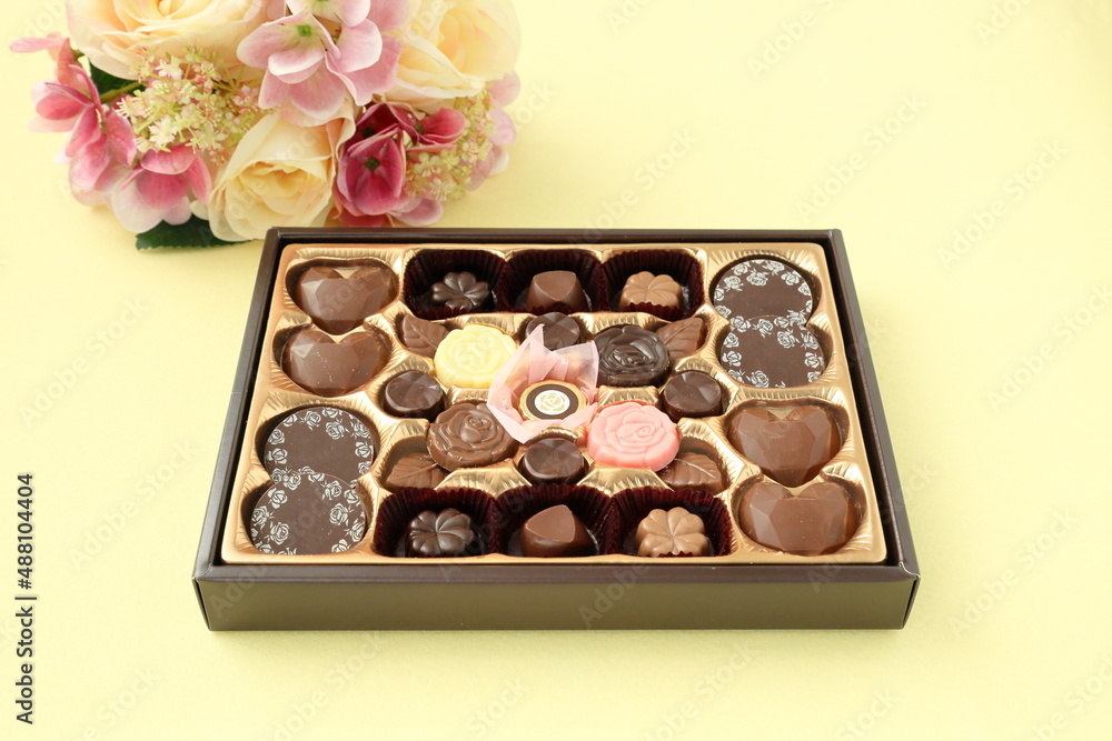 チョコレートの詰め合わせと花束