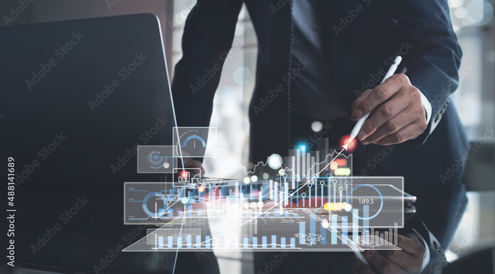 Businessman using digital tablet analyzing sales data with financial trading graph and economic growth report on virtual screen