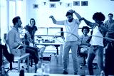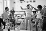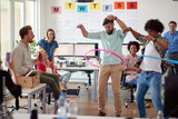 Two male employees is playing with hula-hoop in the office with their colleagues. Employees, job, office