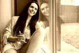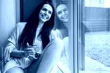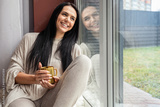 Happy beautiful brunette lady laughing enjoying weekend sitting on windowsill with tea mug relax