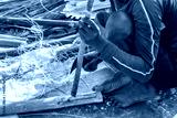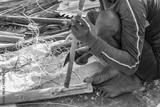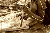 Rural craftsman cutting bamboo sticks for creating furniture items at a handicraft fair at Kolkata, India