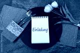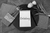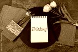 Notizblock mit dem Text Einladung, mit Blumen und Essbesteck.