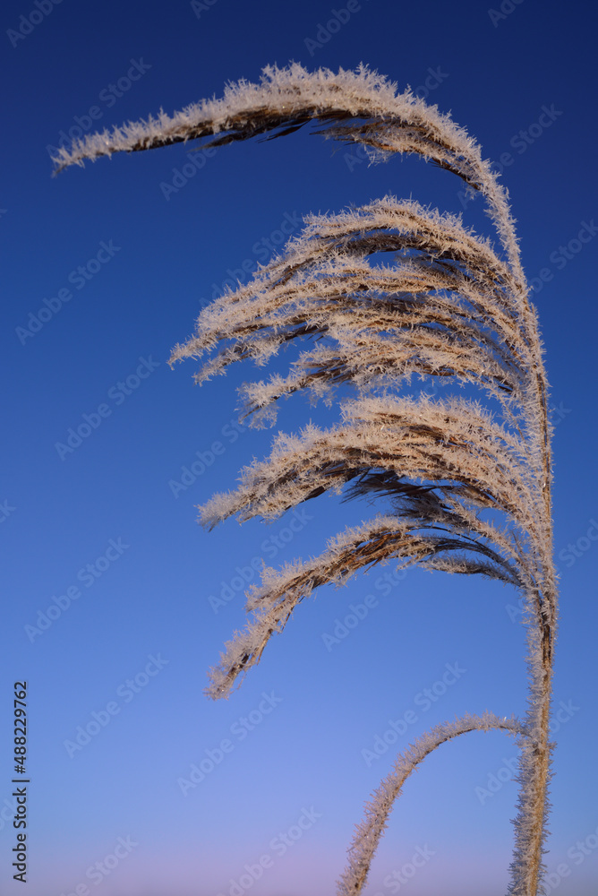 Close up of a frozen flower of grass covered in frost and lit by the morning sun against a blue sky in winter