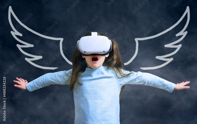 Child flying in virtual reality, cute kid looking in VR glasses