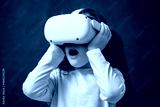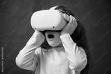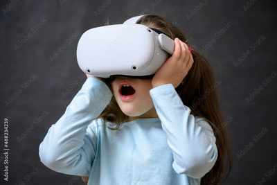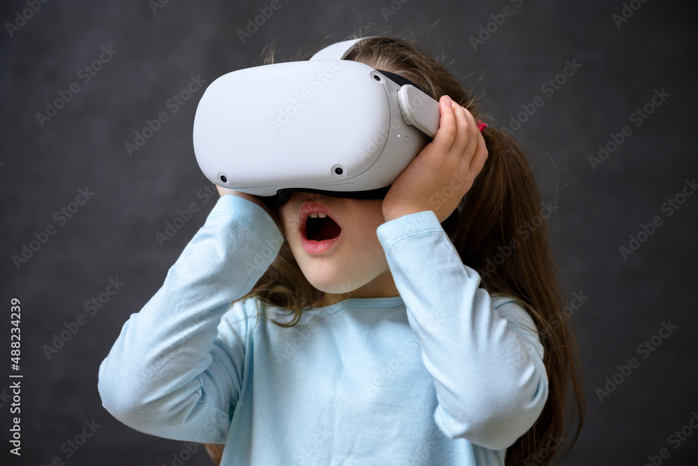 Kid using virtual reality headset, surprised child looking in VR glasses